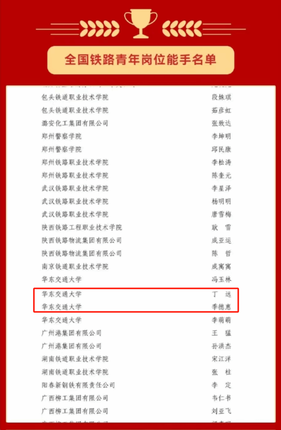 為選樹典型,激勵(lì)奮進(jìn),進(jìn)一步促進(jìn)青年成長(zhǎng)成才,全國(guó)鐵道團(tuán)委決定授予賈強(qiáng)等1251名青年“全國(guó)鐵路青年崗位能手”稱號(hào)。其中我院教師丁遠(yuǎn),季德惠榮獲該稱號(hào)。