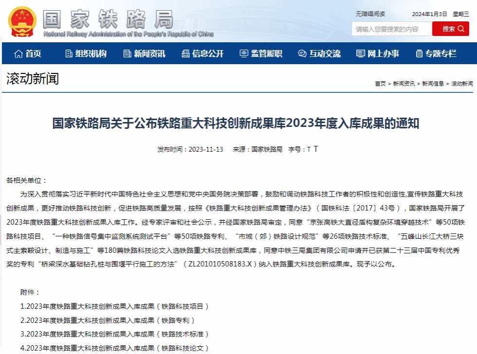 鐵路重大科技創(chuàng)新成果庫由國(guó)家鐵路局設(shè)立,包括鐵路科技項(xiàng)目、鐵路專利、鐵路技術(shù)標(biāo)準(zhǔn)和鐵路科技論文四類,在鐵路行業(yè)科技創(chuàng)新方面具有標(biāo)志性和代表性,具有較強(qiáng)的實(shí)用性,標(biāo)志著鐵路科技的先進(jìn)水平,代表著鐵路科技的發(fā)展方向。經(jīng)專家評(píng)審和社會(huì)公示,并經(jīng)國(guó)家鐵路局審定,2023年共有50項(xiàng)鐵路科技項(xiàng)目、50項(xiàng)鐵路專利、26項(xiàng)鐵路技術(shù)標(biāo)準(zhǔn)、180篇鐵路科技論文入選鐵路重大科技創(chuàng)新成果庫。