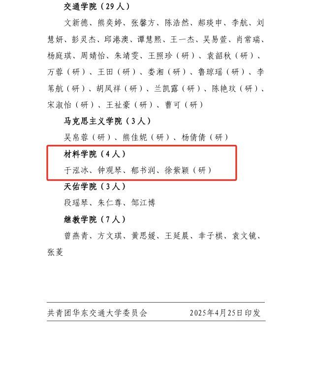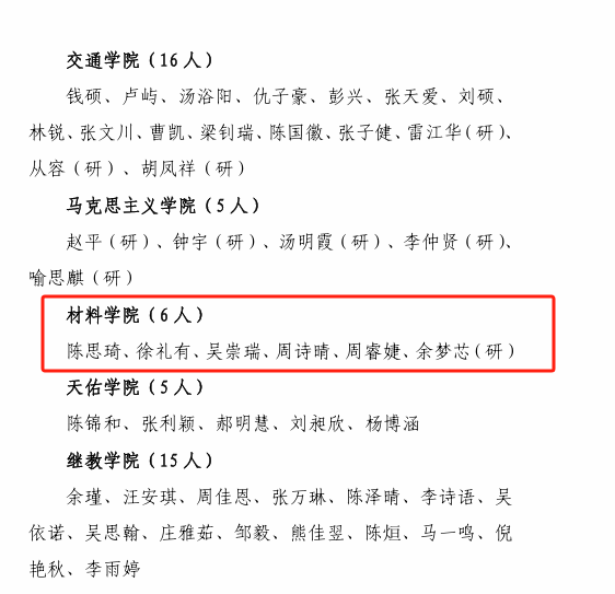 其中“優(yōu)秀團(tuán)學(xué)骨干”為陳思琦、徐禮有、吳崇瑞、周詩晴、周睿婕、余夢芯(研),“優(yōu)秀志愿者”為于泓冰、鐘觀琴、郁書潤、徐紫穎(研)。