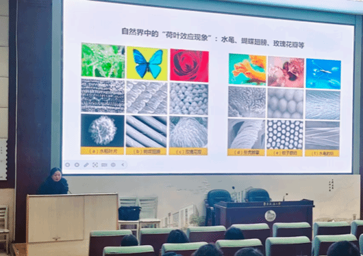 講座從“荷花為何能出淤泥而不染”破題,揭秘了“荷葉效應(yīng)”的材料密碼。同時(shí),麻老師還分享了自然界的“超疏水同伴”,并鏈接了產(chǎn)業(yè)應(yīng)用,指出這些均從自然智慧中“轉(zhuǎn)化而來(lái)”。
